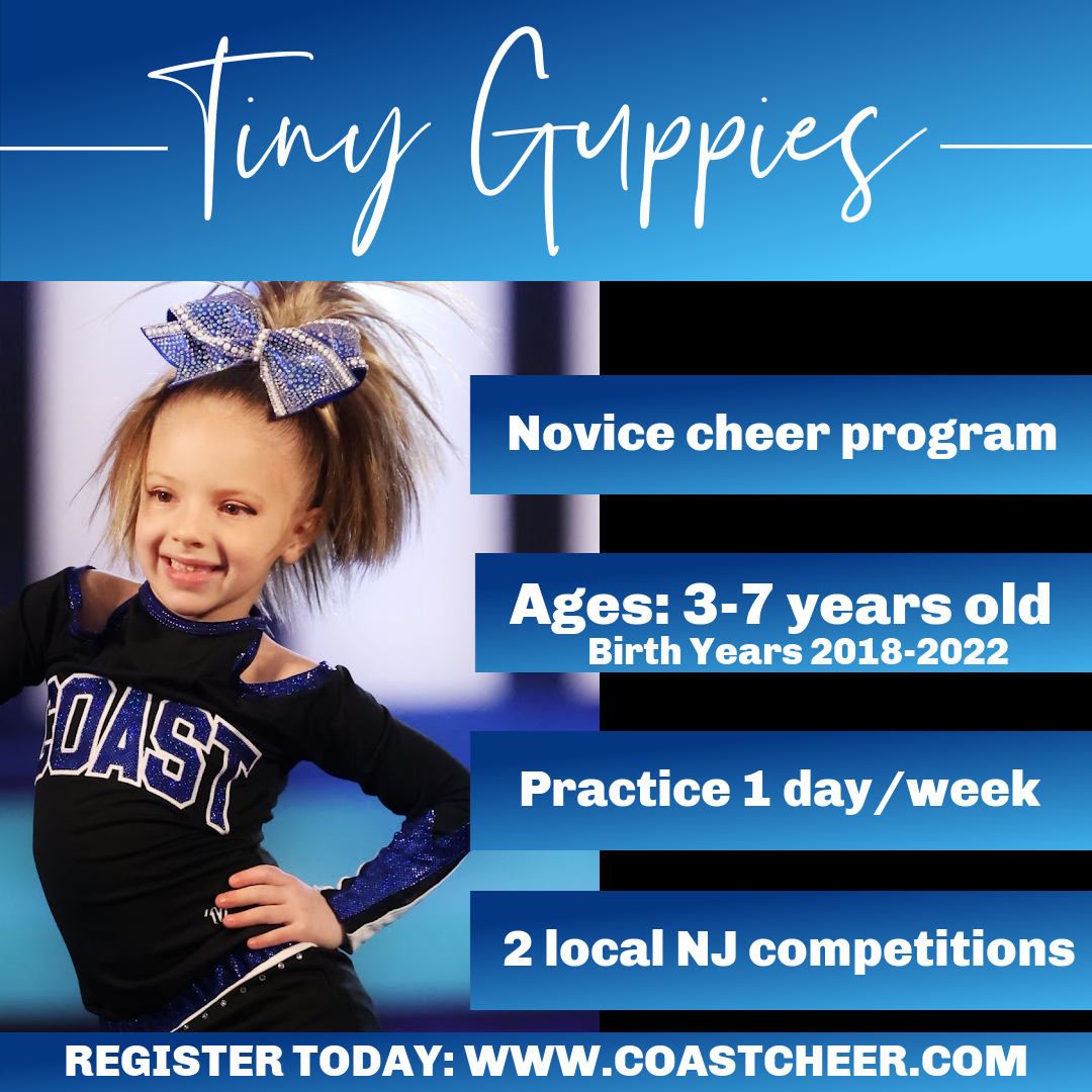 The Guppies season runs from September to April, with practices held once per week on TUESDAYS from 4:30-5:30 PM. Athletes will learn cheer fundamentals, build confidence, and showcase their skills at two local competitions.